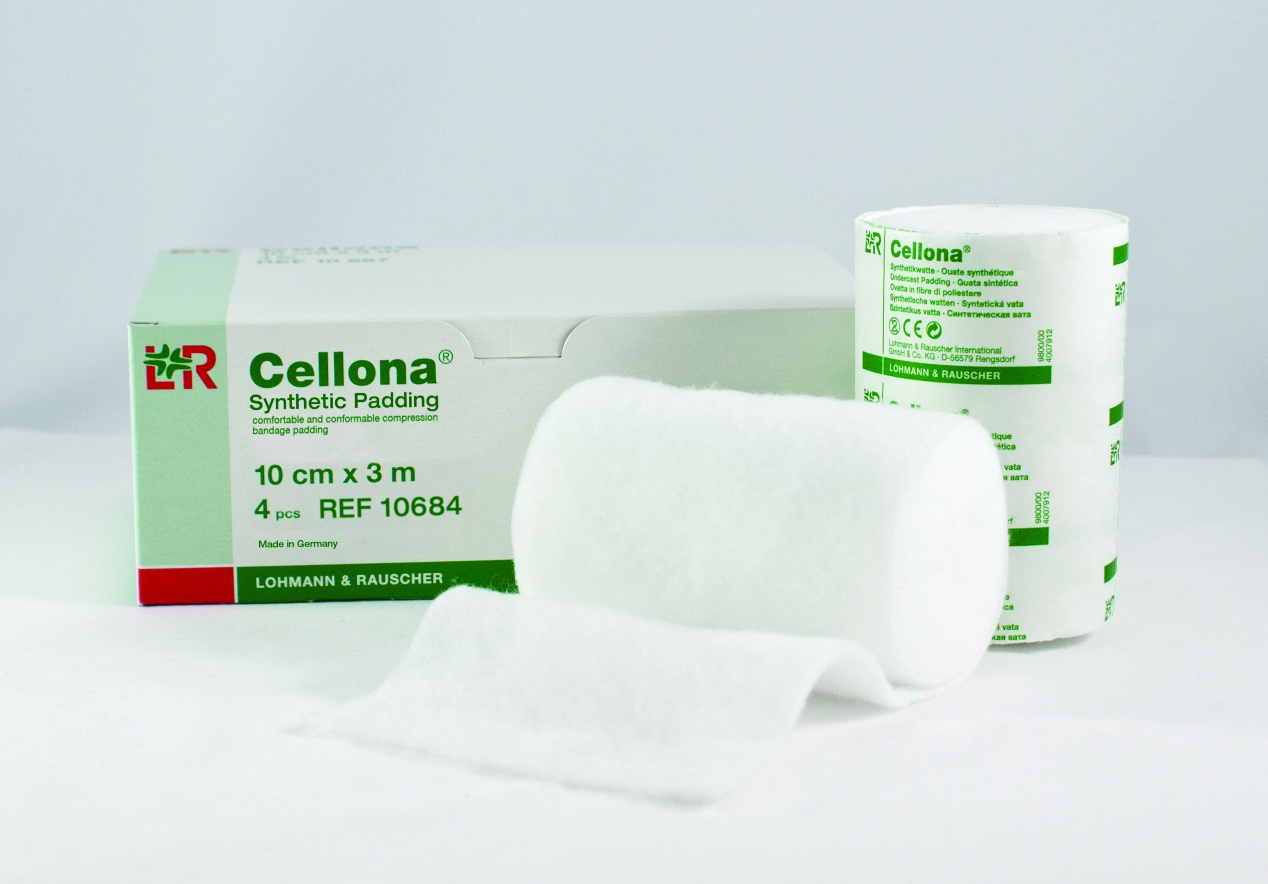 Gifsbómull til að bólstra undir gifs. Stærðir 6-10-15 cm x 3m, 100% polyestertrefjar.